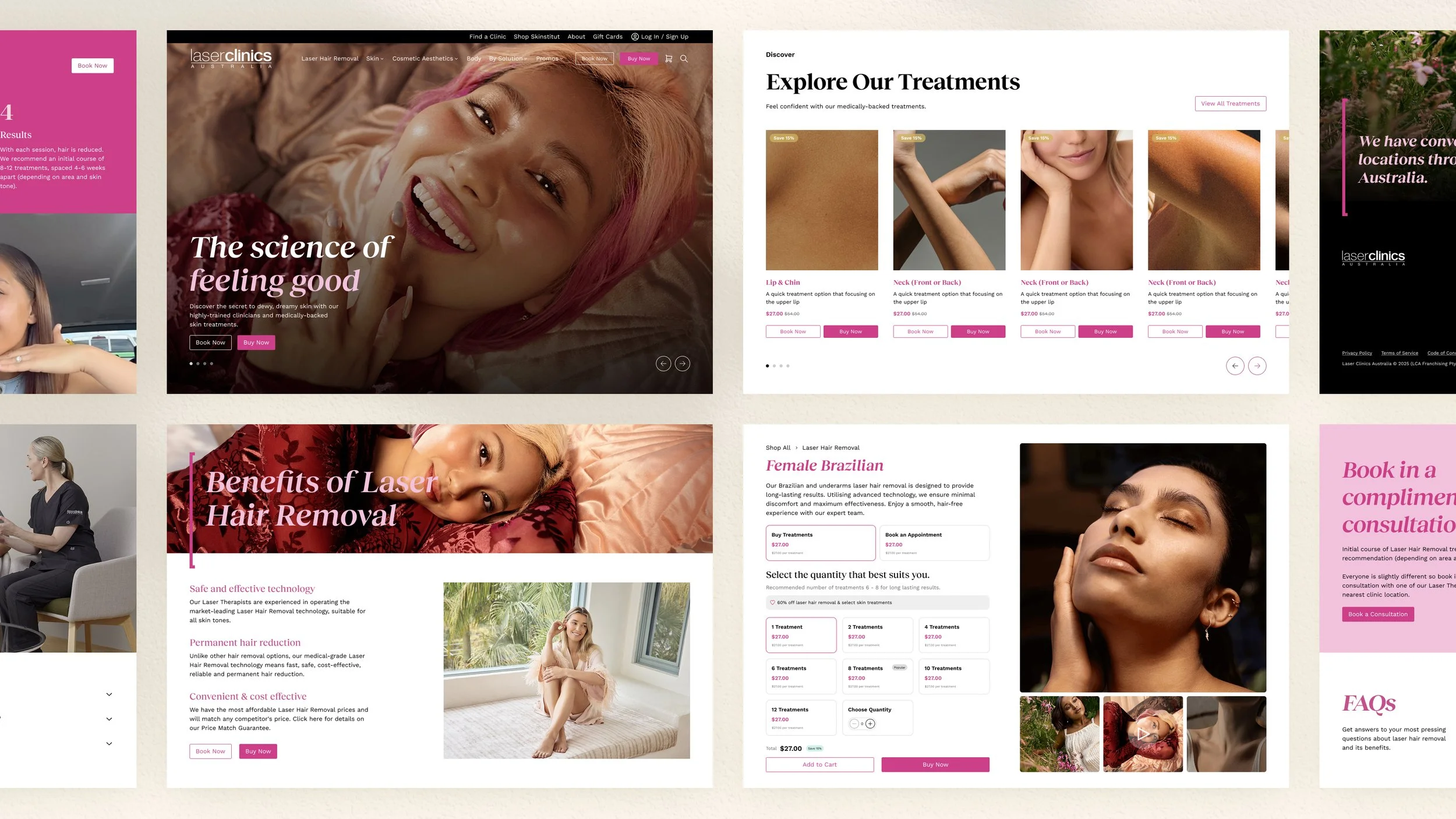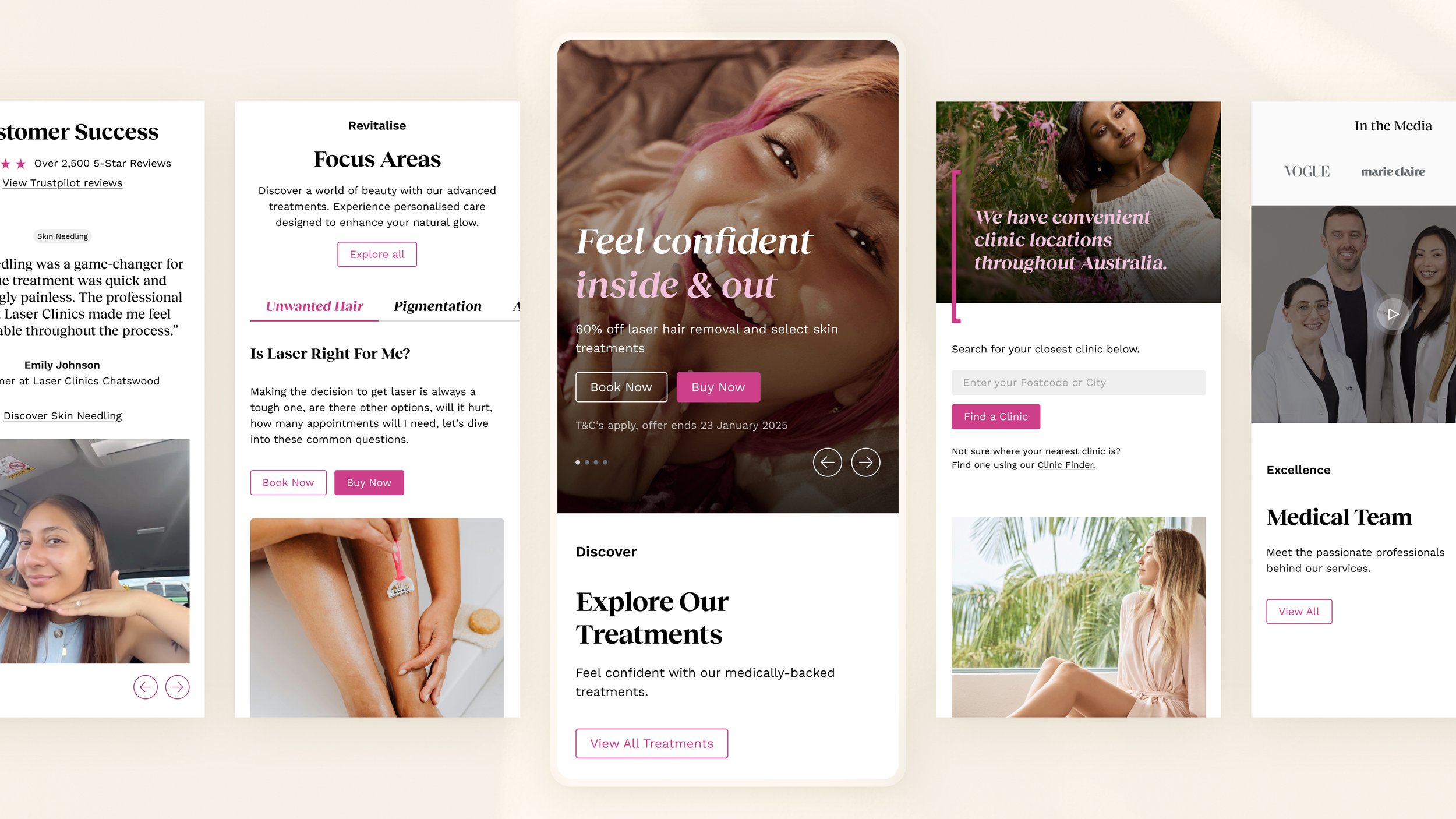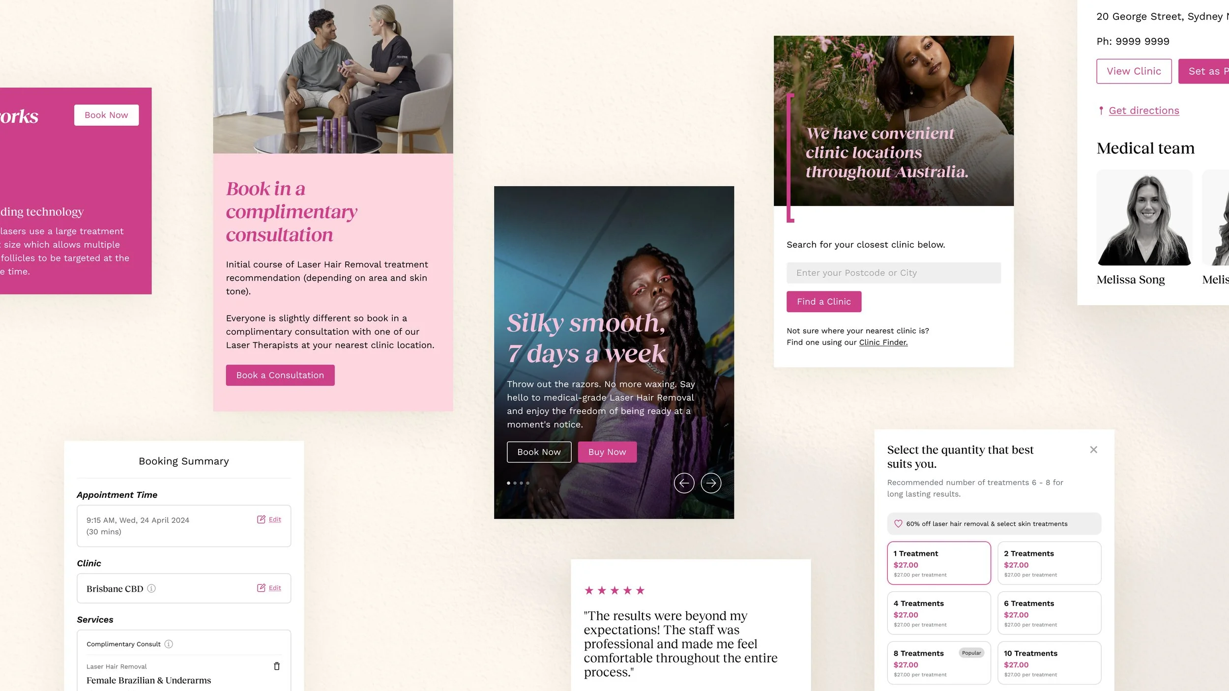 Laser Clinics had the brand and global footprint, but their digital experience wasn’t keeping up. The site and booking system were clunky, dated, and holding back growth. We stepped in to rewrite the journey: restructuring flows, testing with real users, and crafting a design system that added polish, confidence and a little motion magic. Partnering with Aligent, we delivered seamless booking and buying experiences that felt as good as they looked — functional, beautiful, and perfectly in step with the brand’s ambition.