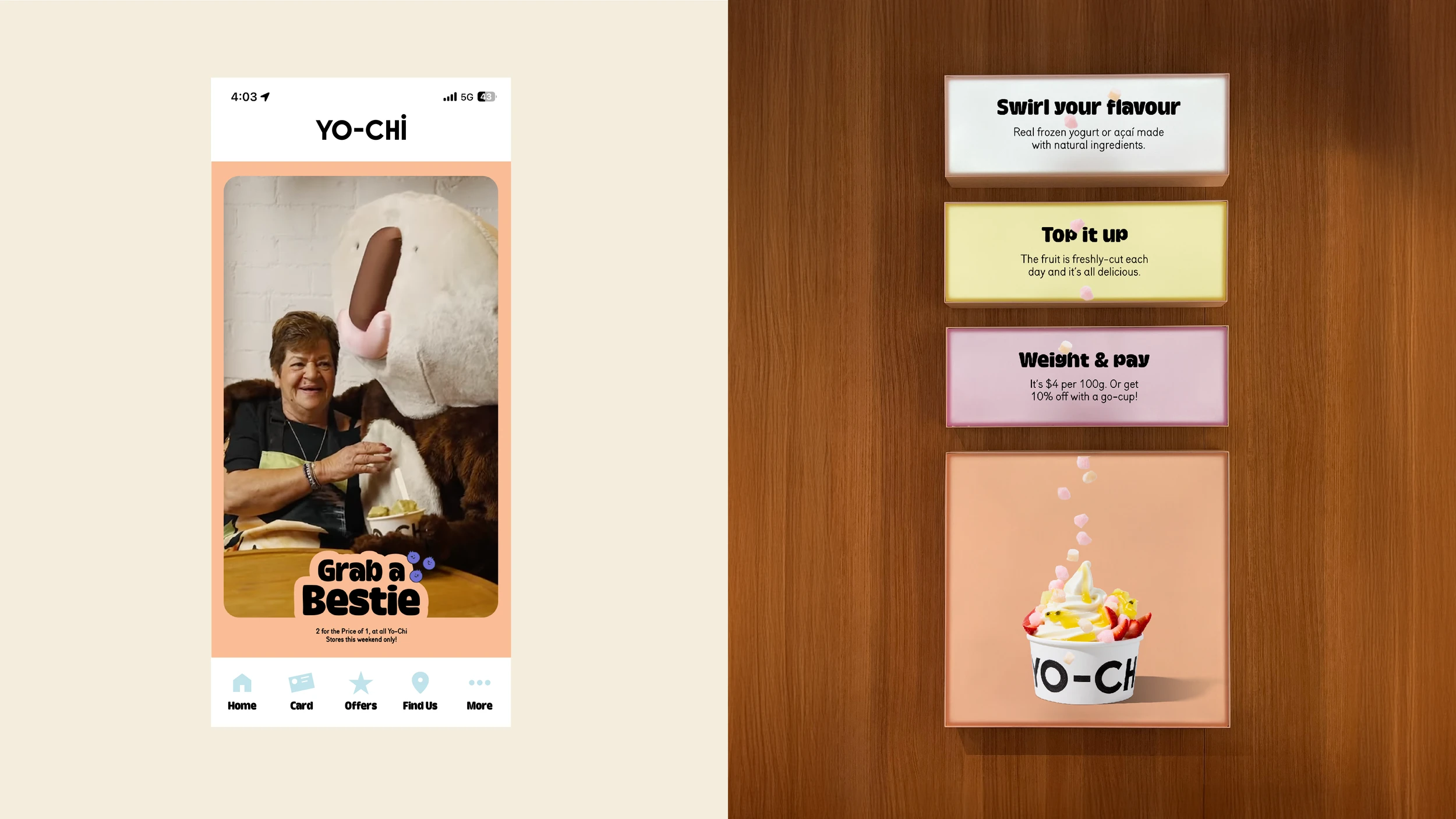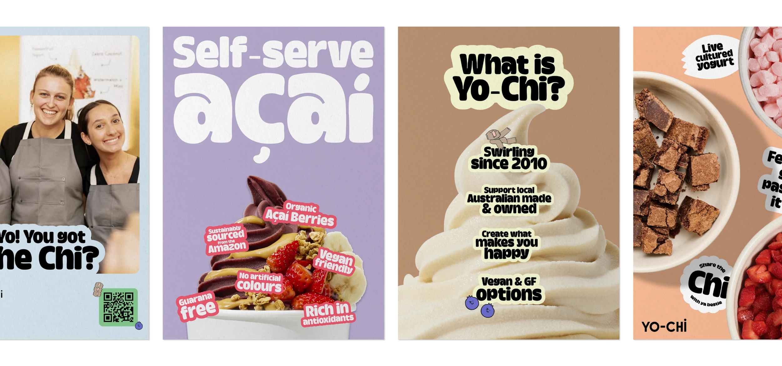 The transformation went beyond surface-level change. We refreshed their full brand system for international rollout and internal adoption, embedding Positive Action into every layer of the business. Visually, we evolved their look with greater boldness, depth, and playfulness, creating a more flavourful and confident identity. This gave Yo-Chi the clarity and consistency to move beyond being just a fun frozen yoghurt brand — to stand as a company committed to making positivity tangible across product, place and community.